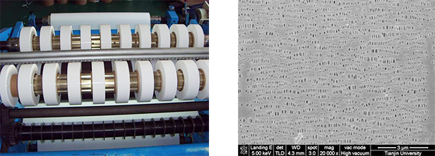 以PE為主要原料,混合多種牌號的輔料經(jīng)充分攪拌,通過流延法擠出成型后雙向拉伸,經(jīng)過萃取工藝成孔,再經(jīng)過橫向拉伸后收卷、分切,生產(chǎn)出濕法雙向拉伸鋰電隔膜。配備有高精度檢測儀器,采用與中國著名科研院校合作共同研發(fā)的生產(chǎn)工藝,主要生產(chǎn)厚度為8μm至25μm不同規(guī)格的鋰離子電池隔膜。
